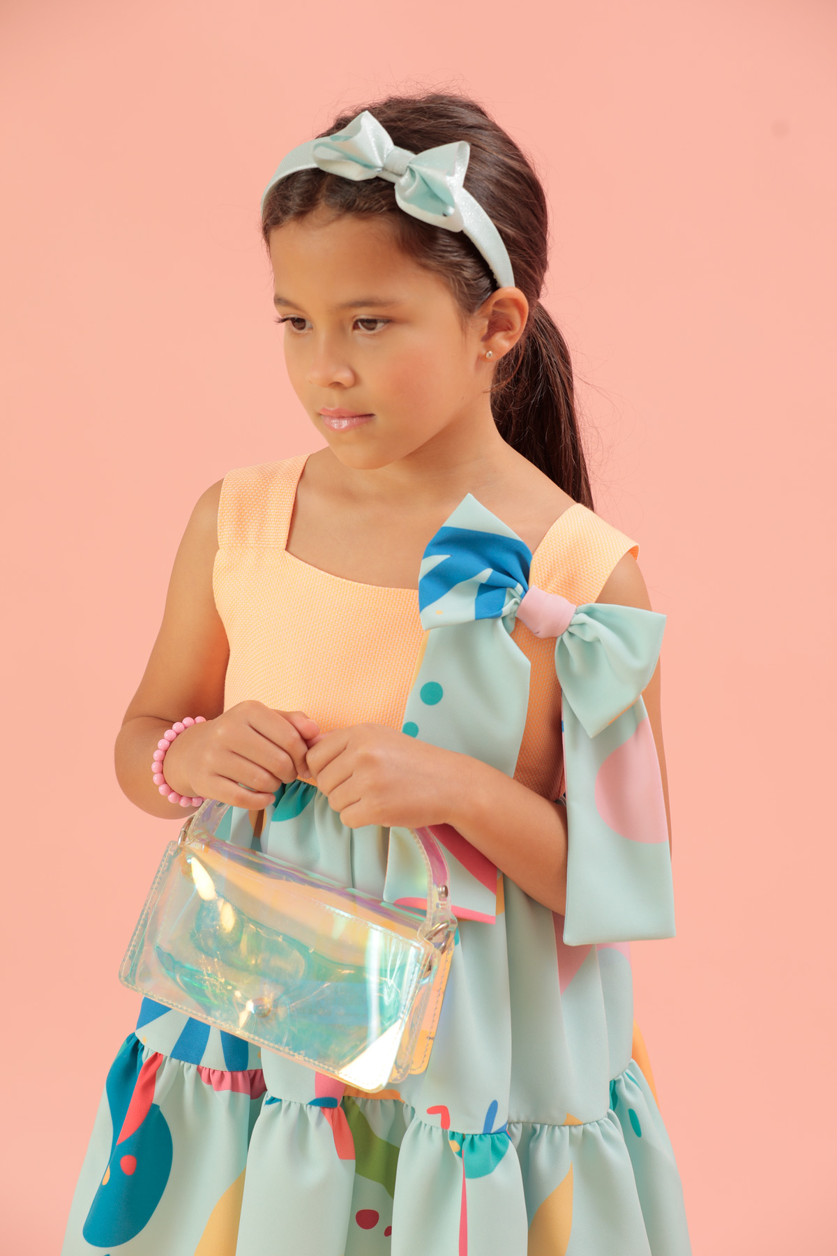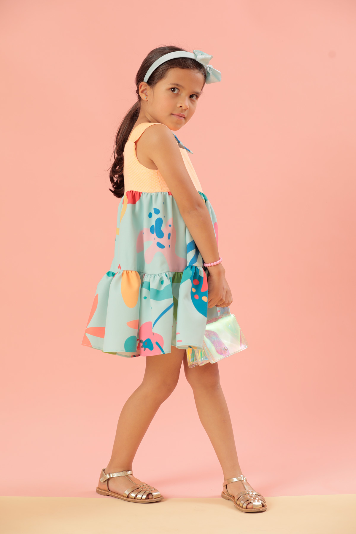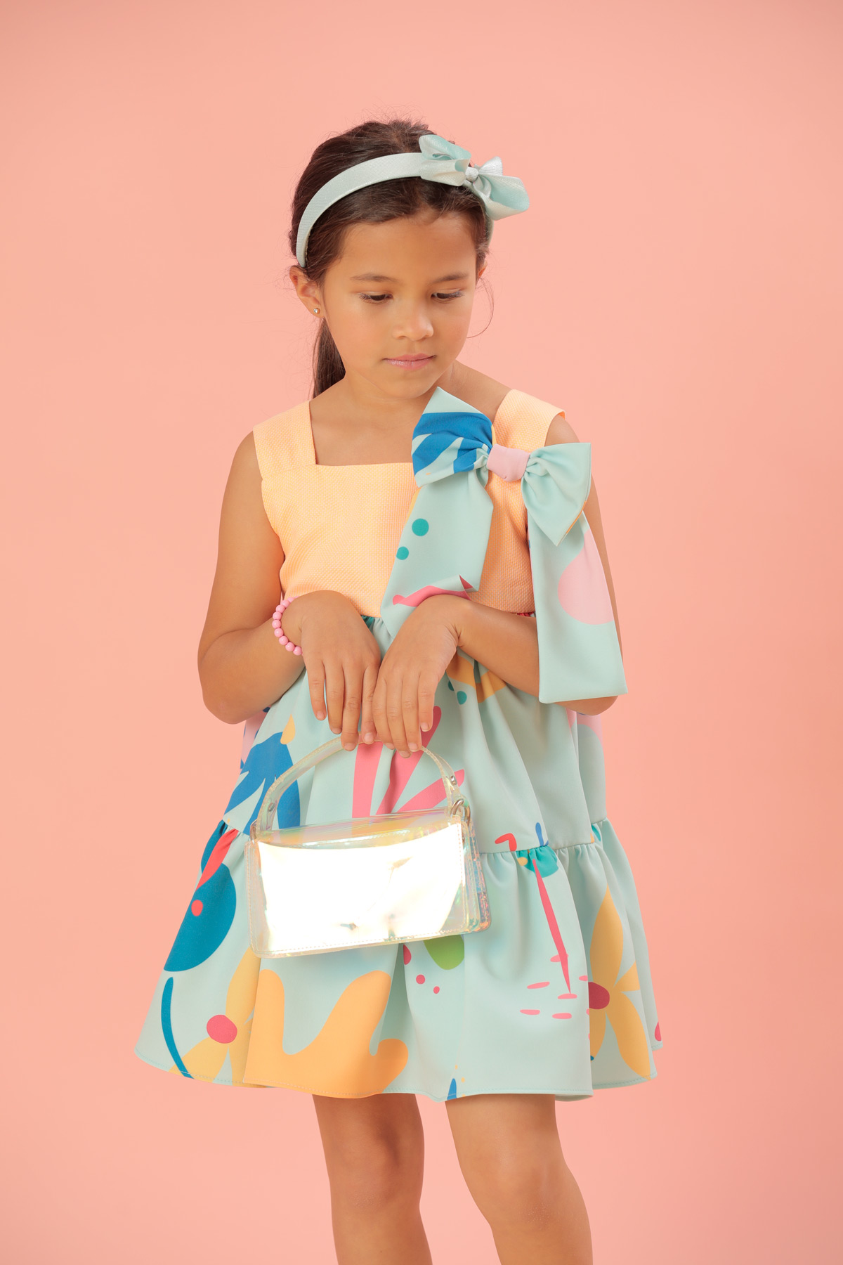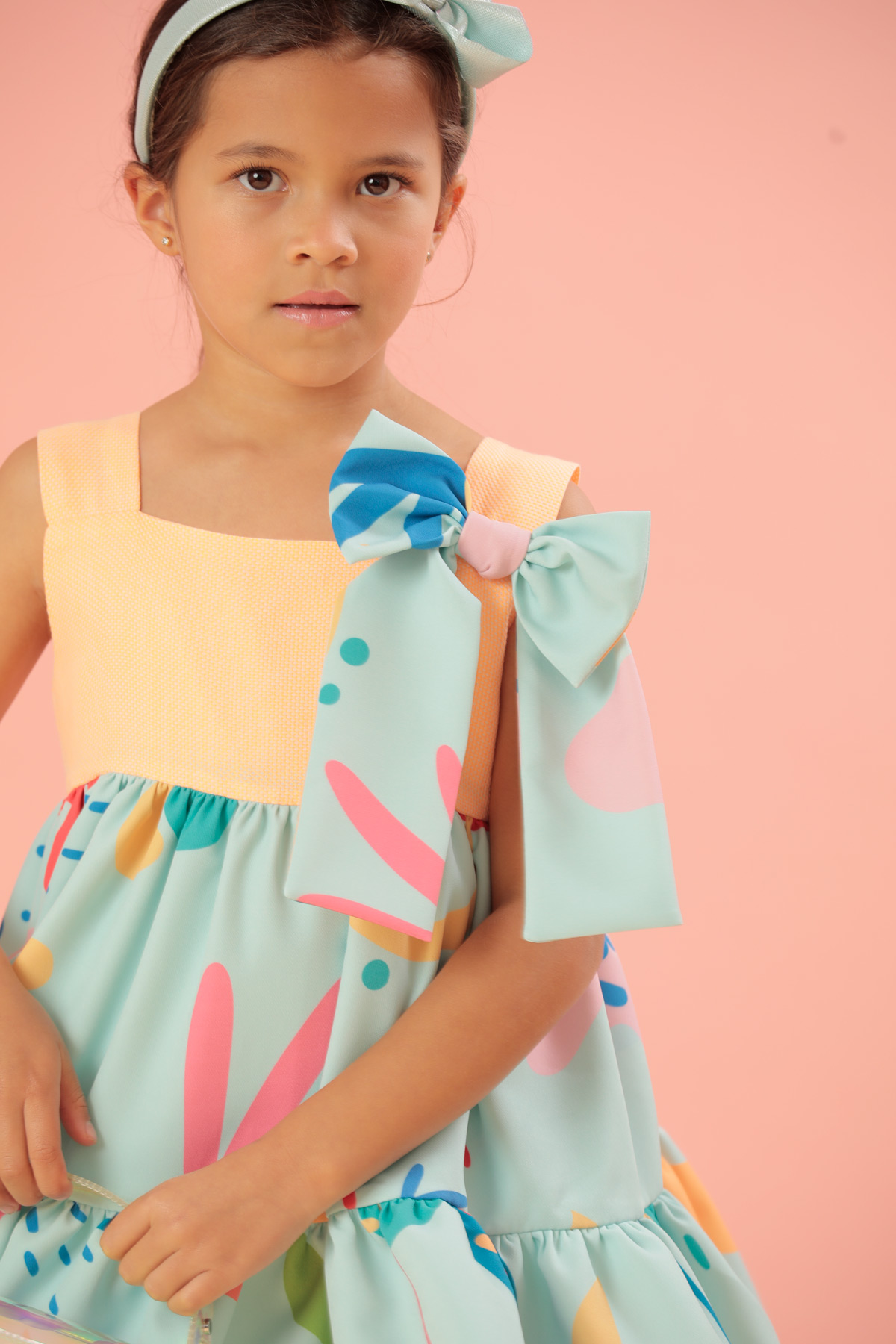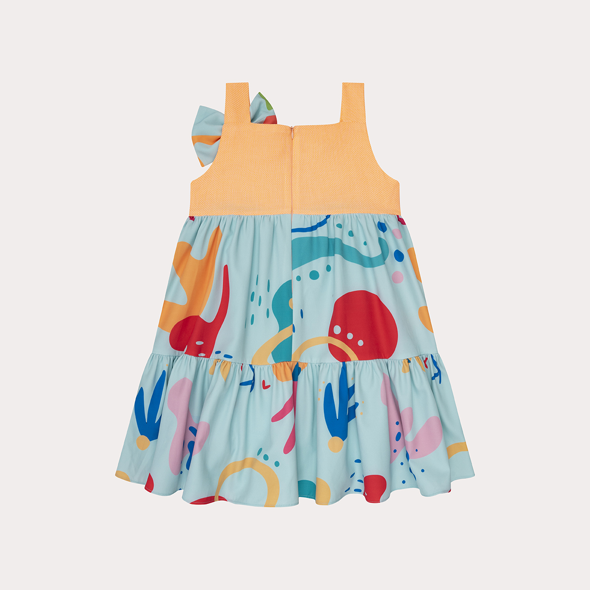Este hermoso vestido en tonos pasteles nos recuerda lo delicioso que es el verano tiene un diseño en manga sisa en su parte de arriba en color naranja y una falda en dos tiempos y un hermoso lazo lo que lo hace lucir muy casual y elegante a la vez, este forrado en algodón 100%.