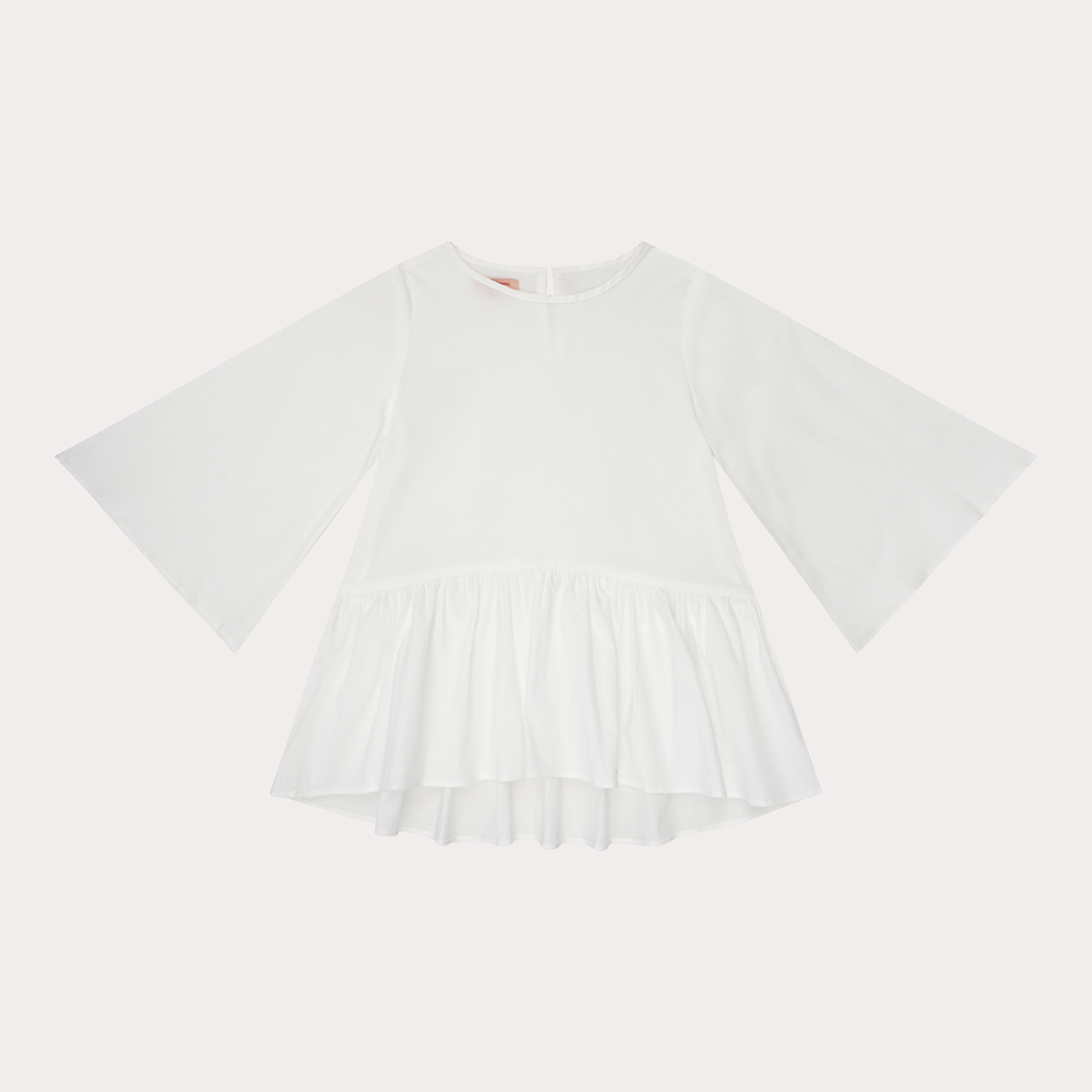 Esta blusa de algodón orgánico presenta una manga acampanada y un volado en su parte inferior lo que la hace ver muy moderna y atemporal. El cuello redondo esta abotonado en la espalda.