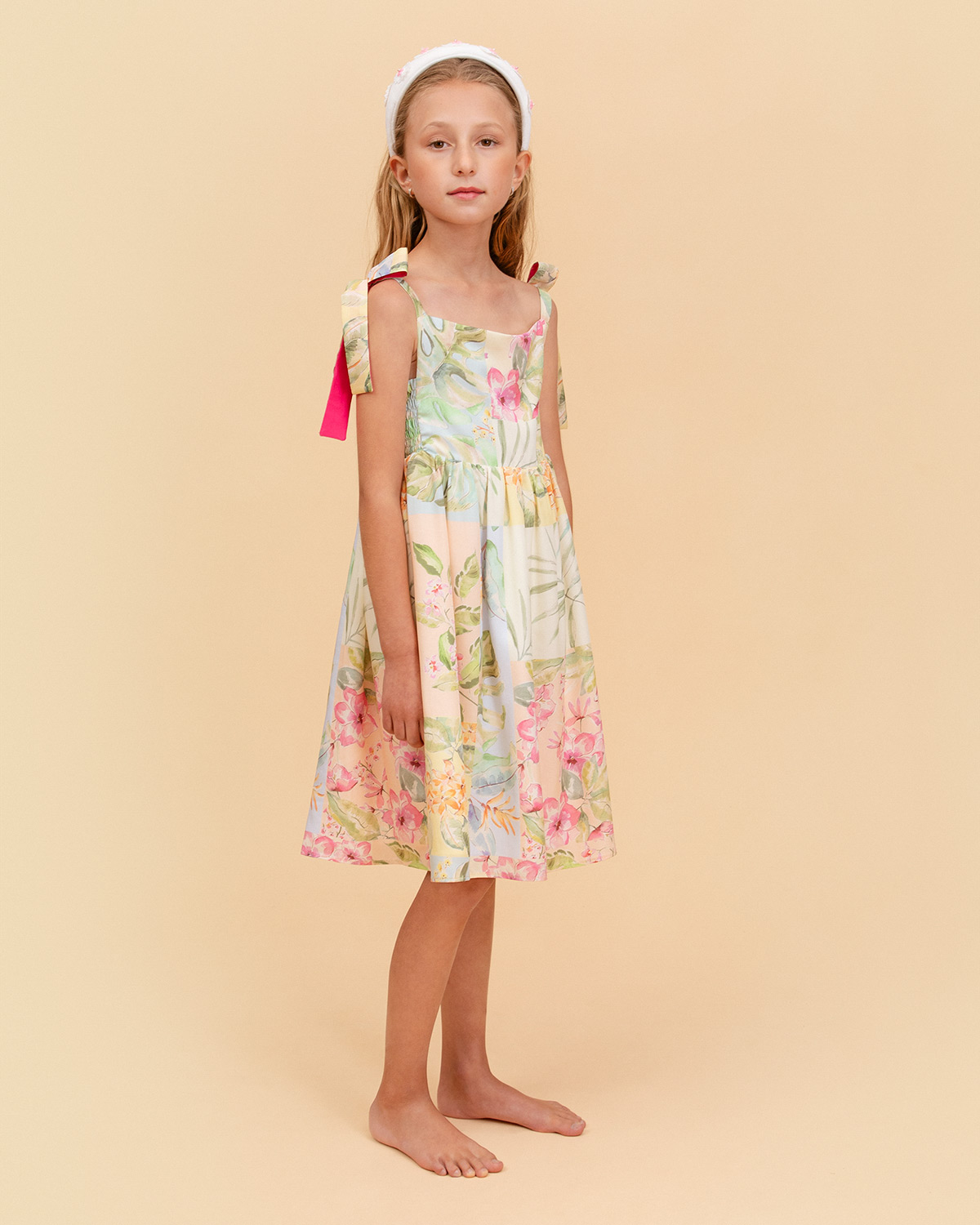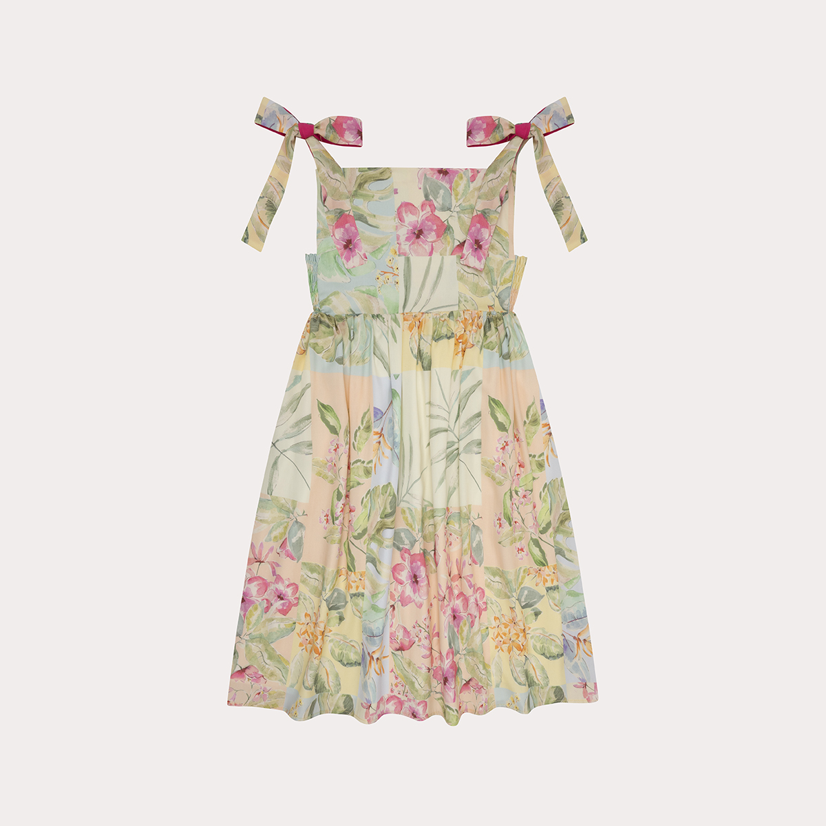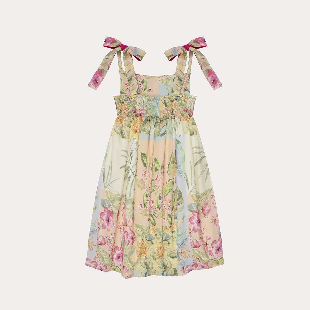 El vestido Malva para niña esta confeccionado en un suave tejido rayón estampado en flores tonos pastel. Este modelo en manga sisa con hermosos lazos a nivel de los hombros y un fruncido en la parte delantera lo hacen un diseño lleno de frescura.