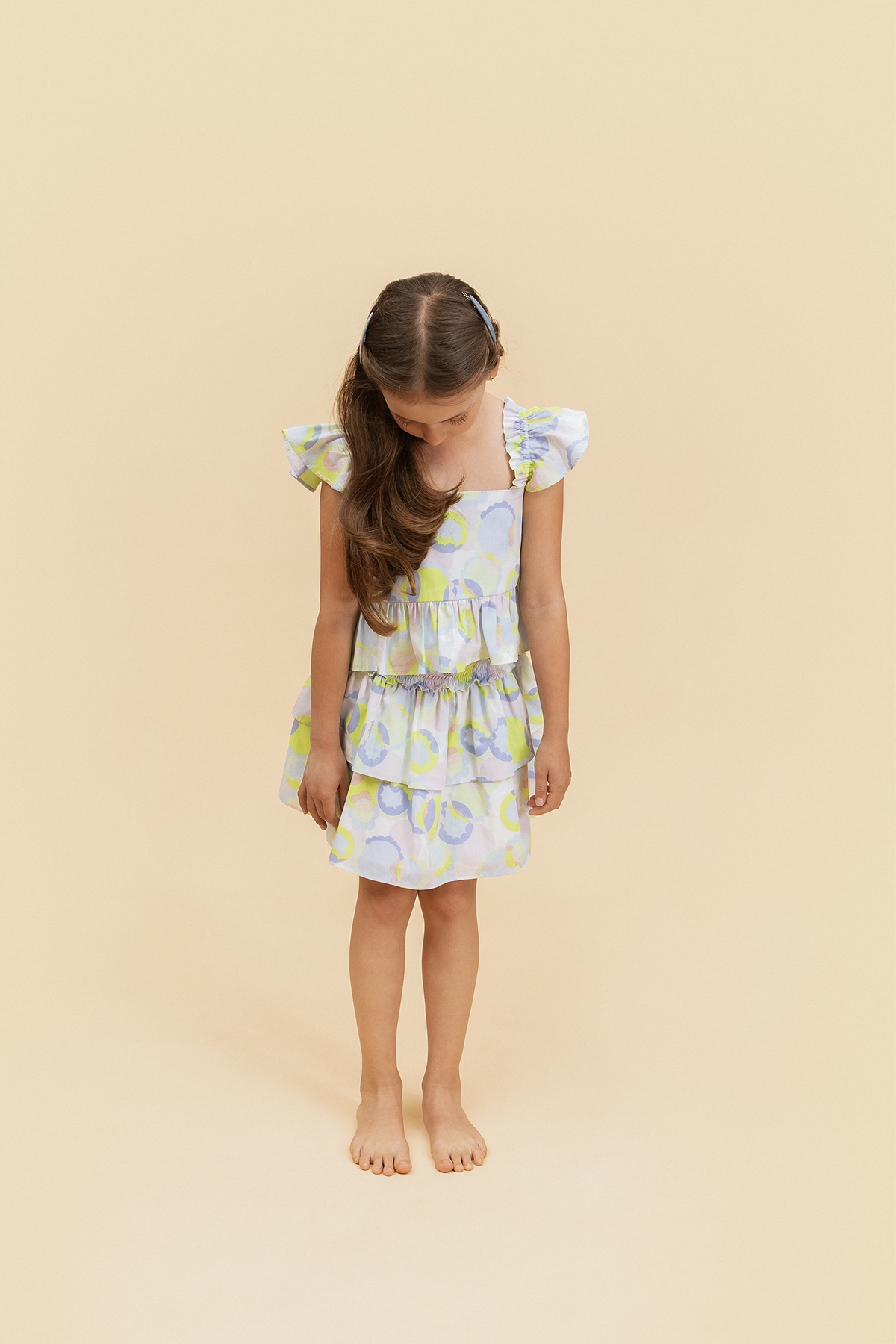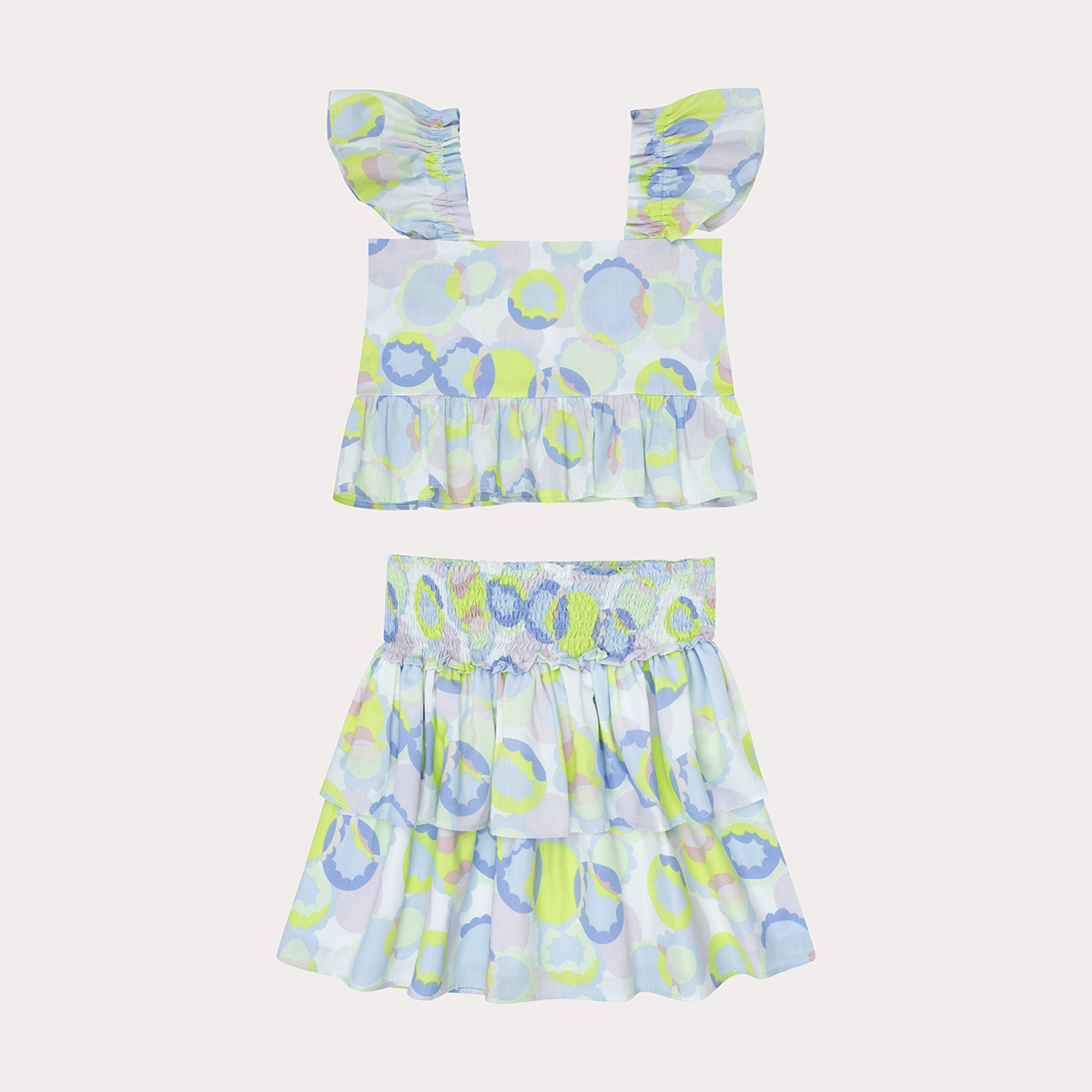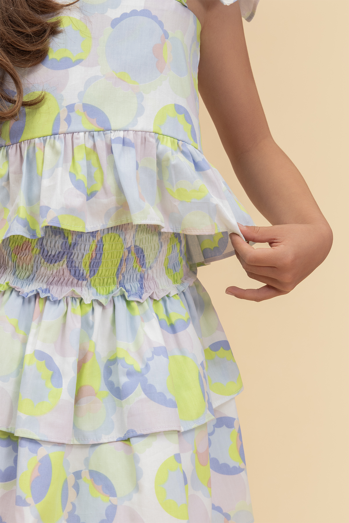 Los hombros con boleros le aportan un bonito volumen a esta blusa de manga sisa, cuenta con un bello escote en v. Su estampado en colores verdes y morados la hacen una prenda muy alegre, esta abotonado en la espalda. falda con un diseño en dos tiempos presenta un fruncido en su pretina lo que la hace más adaptable para las niñas, Su estampado en colores verdes y morados la hacen una prenda muy alegre.
