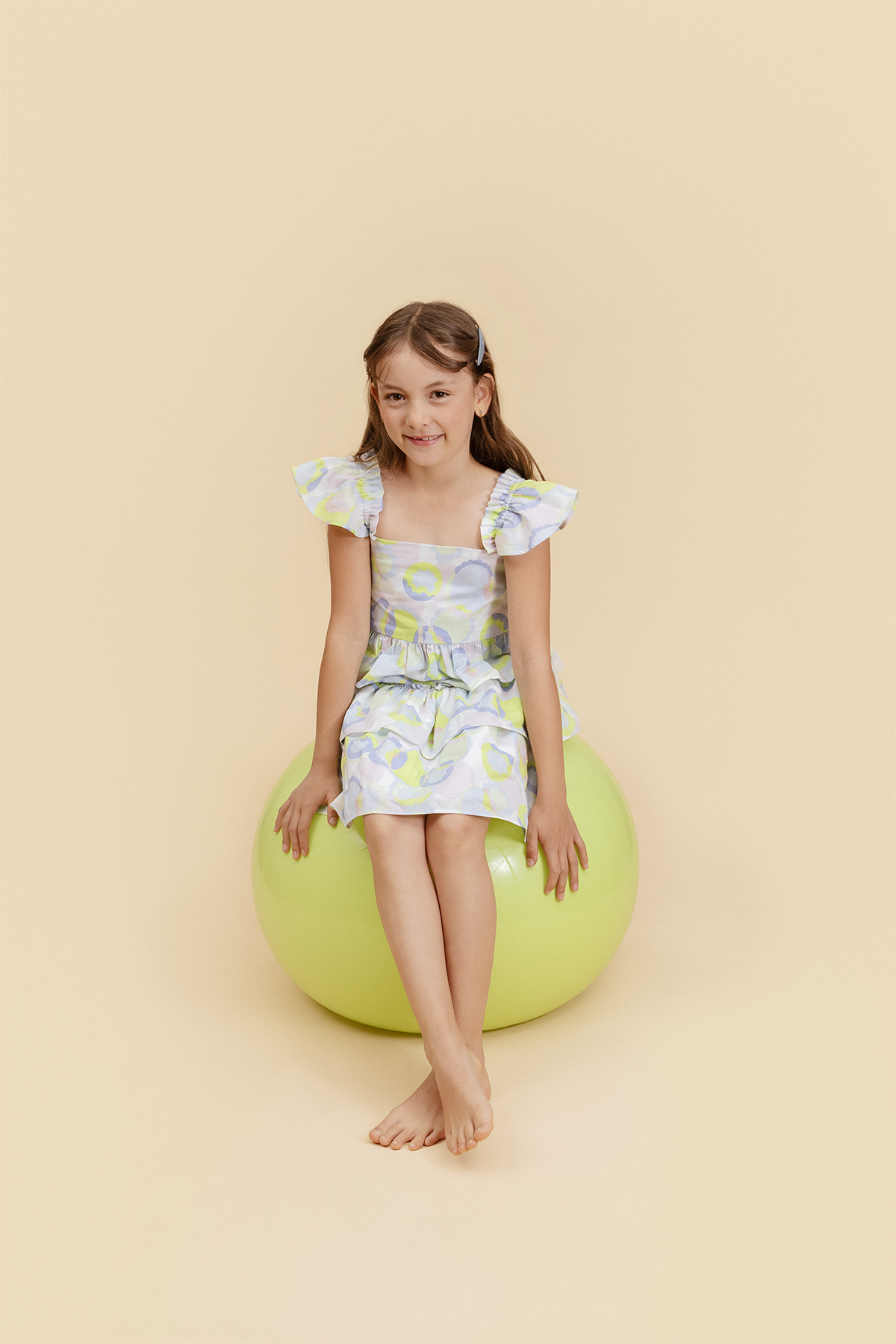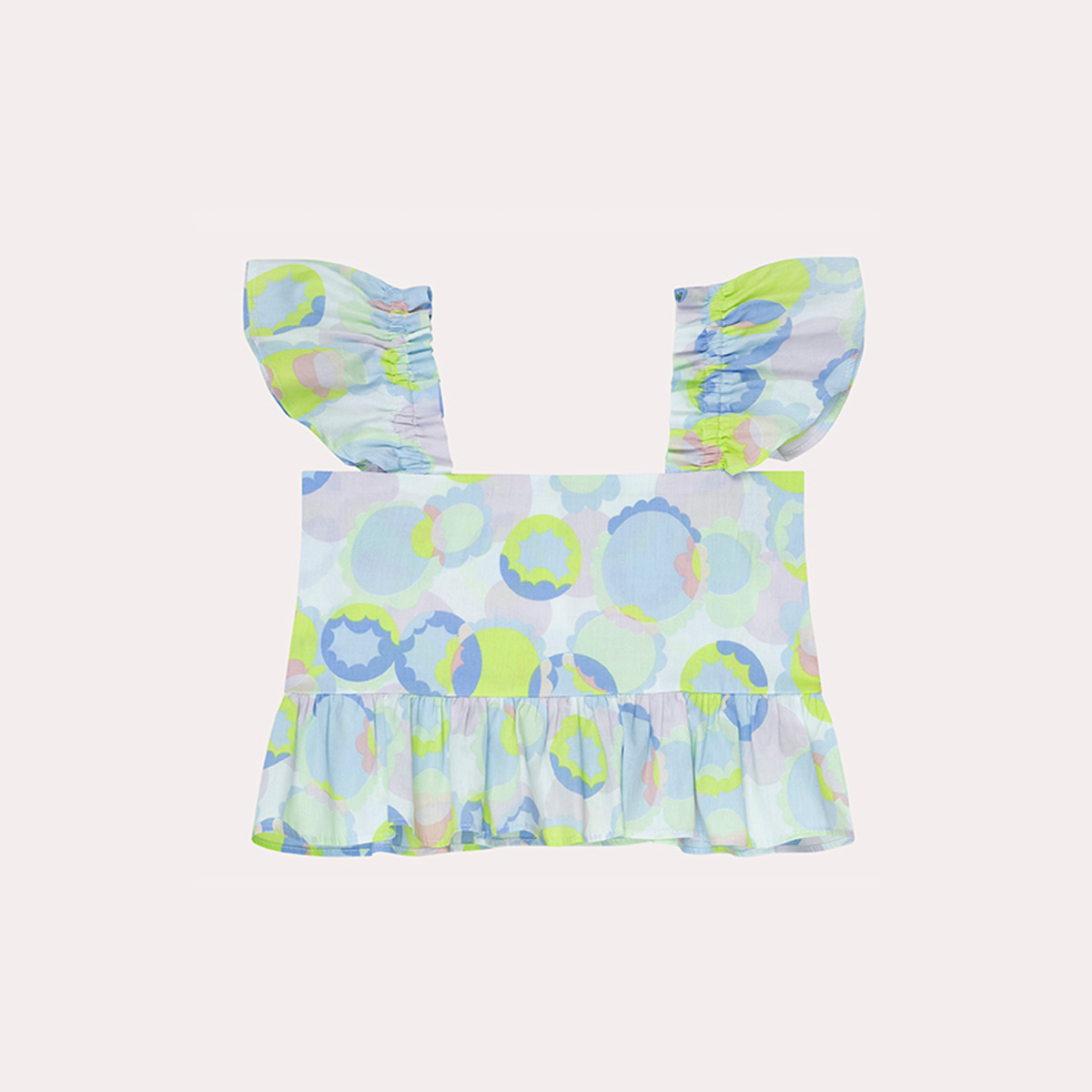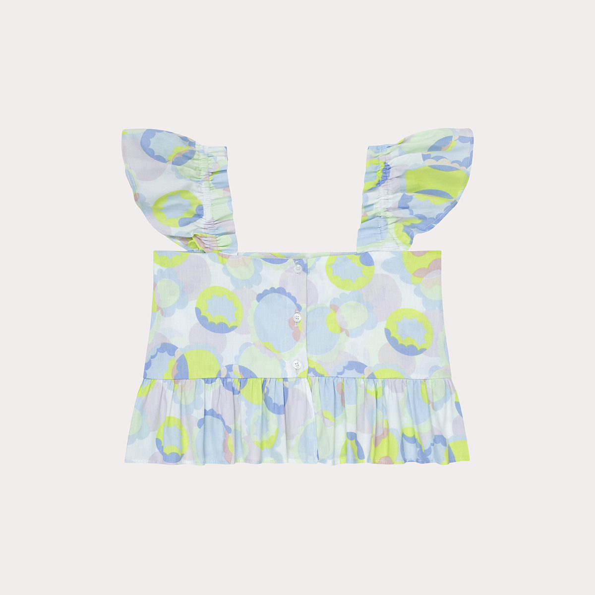 Los hombros con boleros le aportan un bonito volumen a esta blusa de manga sisa, cuenta con un bello escote en v. Su estampado en colores verdes y morados la hacen una prenda muy alegre, esta abotonado en la espalda. falda con un diseño en dos tiempos presenta un fruncido en su pretina lo que la hace más adaptable para las niñas, Su estampado en colores verdes y morados la hacen una prenda muy alegre.