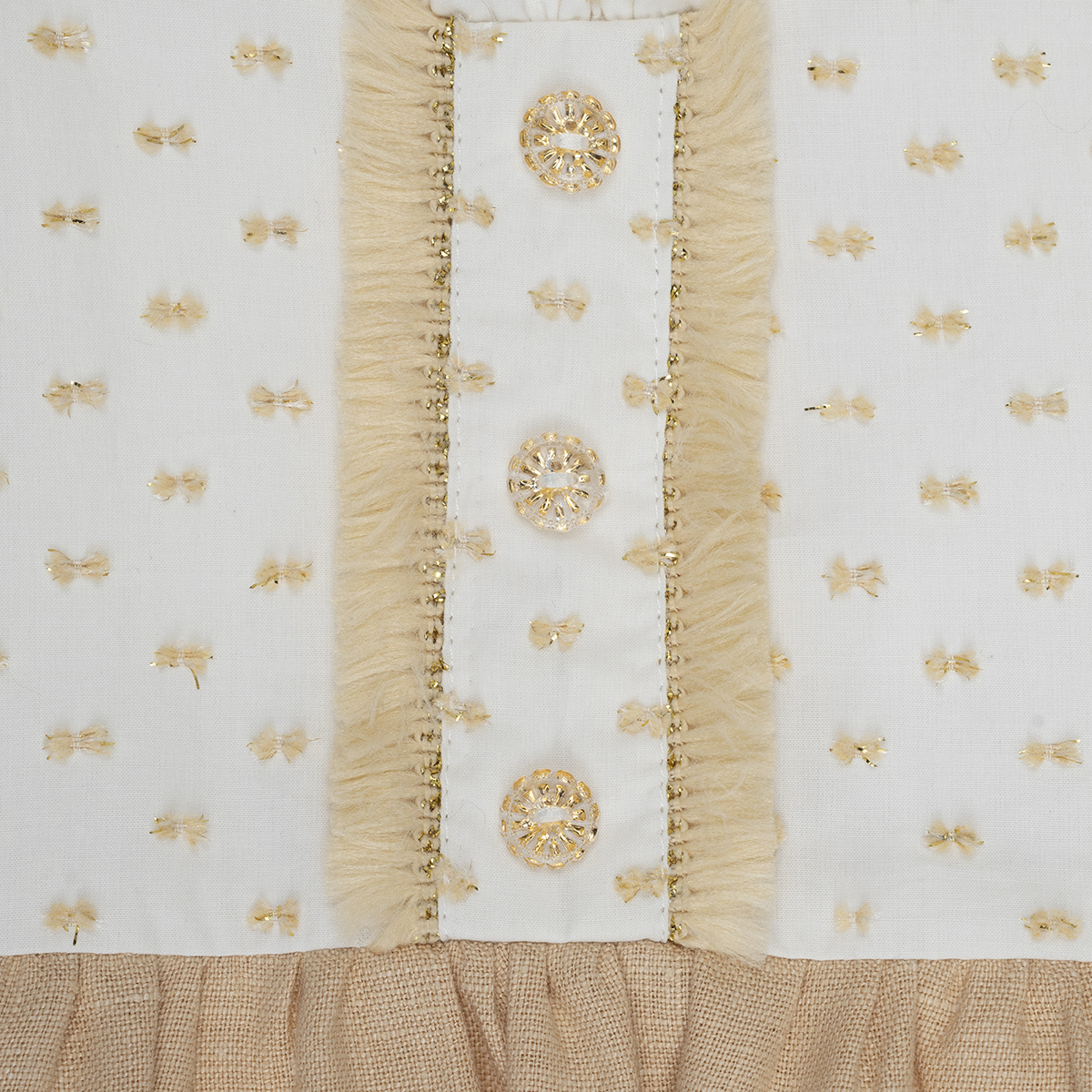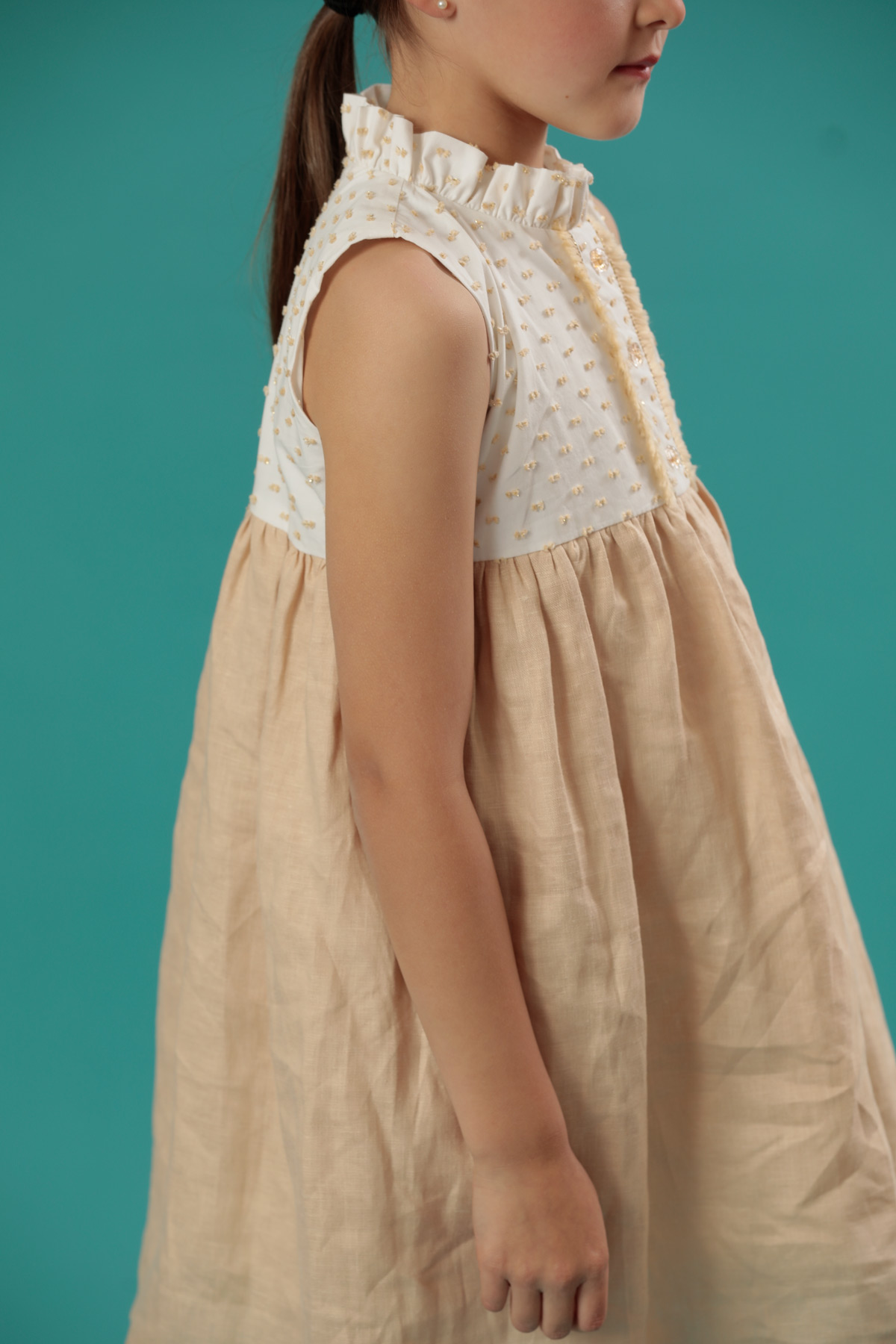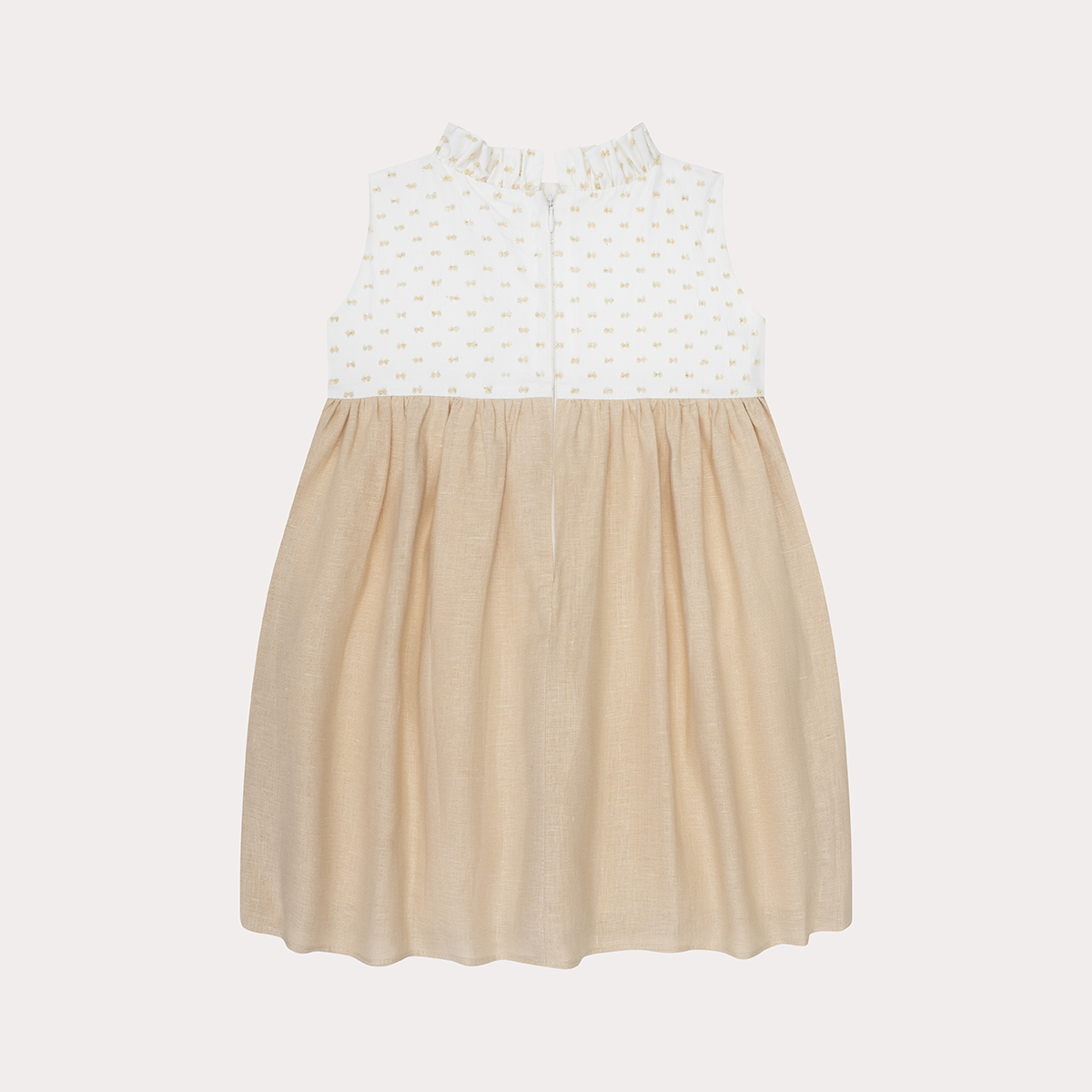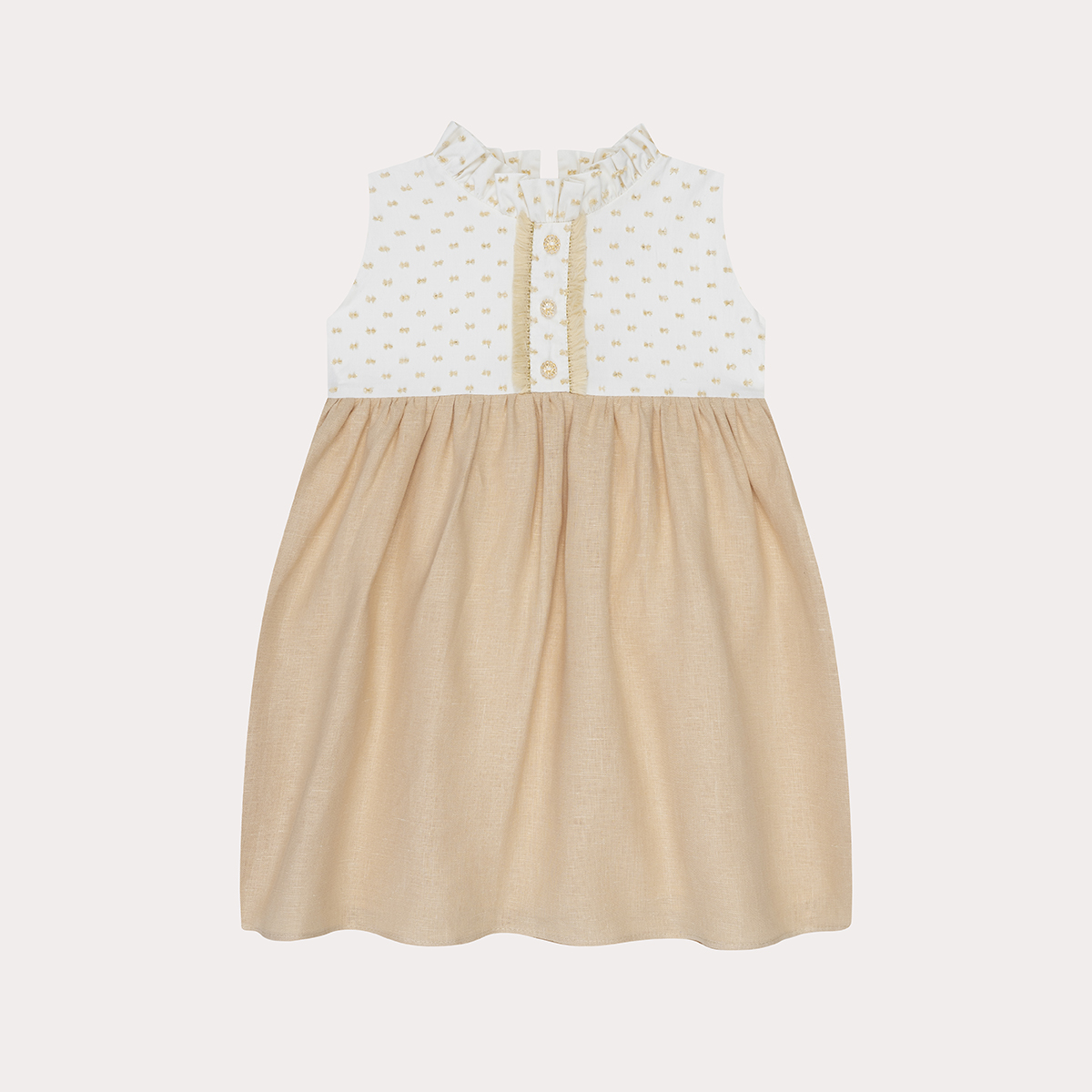 Este vestido completamente atemporal, nos muestra la elegancia en su corte, esta confeccionado en un hermoso plumeti con tonos dorados y en su falda presenta un lino beige, ideal para usarlo en clima cálido y para una ocasión especial.